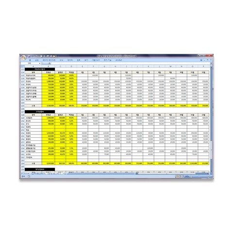 한 개의 서식 파일 안에, 두 개의 워크시트가 있는데, 같은 서식입니다. "(입력)예산짜기" 시트는 즉시 입력해 보실 수 있도록 입력란을 비워둔 시트이고, "(예제)예산짜기" 시트는 작성예를 미리 넣어두었습니다. 참고용입니다.